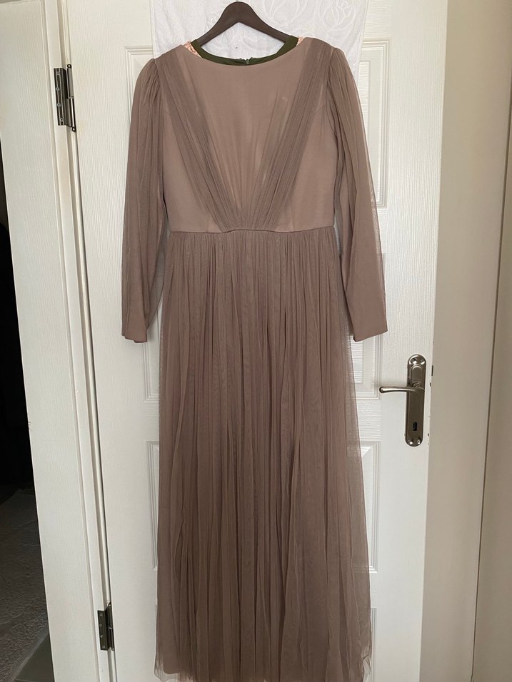 Bej renkli, uzun kollu ve drapeli detaylı kadın abiye elbise. Bol kesimi ve tek renk tasarımı ile düğünler için modern klasik bir seçim. İki kol arası 44 cm boy 145 cm etek ucunda ayakkabıma takıldığı için sökük var fiyatını onu düşünüp ayarladım.mk
