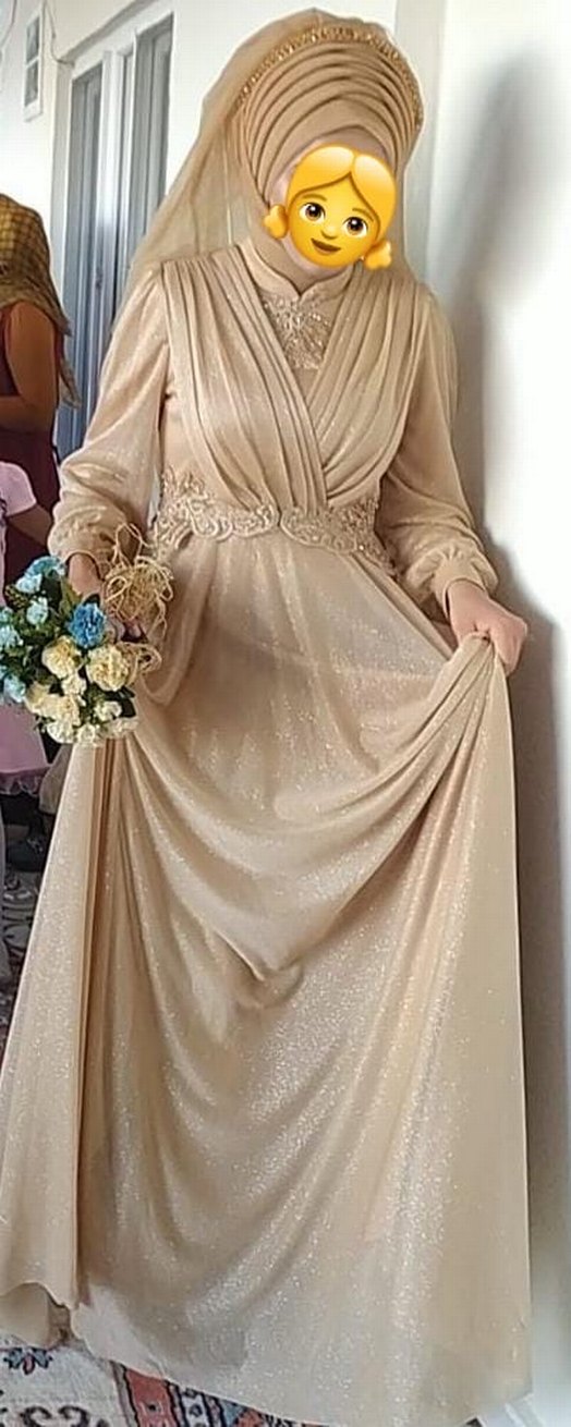 Bej renkli, uzun kollu, V yakalı, drapeli ve bol kesim abiye elbise. Bel kısmında hafif işlemeler ve parlak bir dokusu vardır.