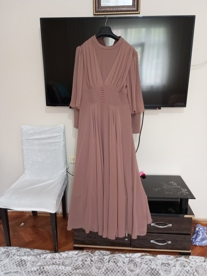 Bej renkte, uzun kollu, V yakalı, drapeli ve bol kesim kadın abiye elbisedir. Modern klasik ve vintage tarzda, düğünler için uygundur.