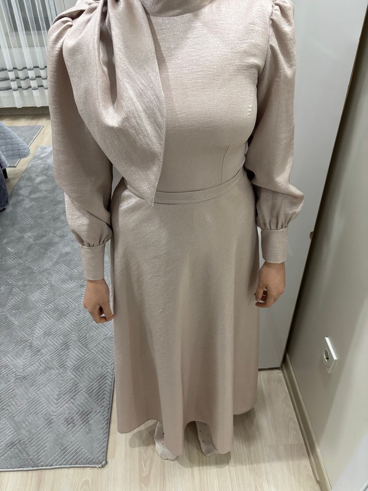 Bej pudra renkte, uzun kollu ve yüksek yakalı bu kadın abiye elbise, drapeli detayıyla klasik Paris şıklığını yansıtır. Ofis için uygundur. ✨ ÖZEL DİKİMDİR