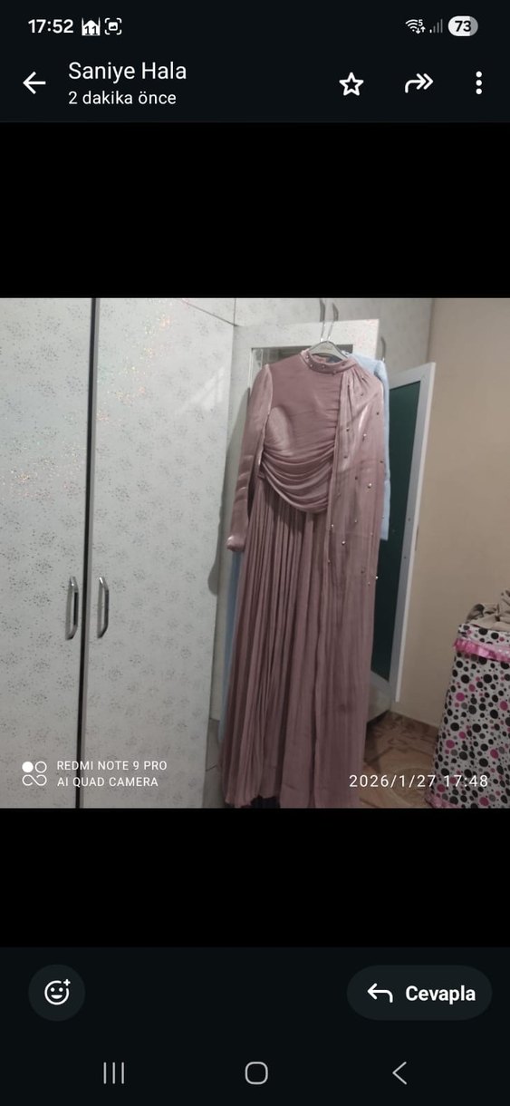 Drapeli ve yüksek yakalı, uzun kollu bej renkte, modern ve minimalist tarzda, düğün için uygun uzun kesim abiye elbise.