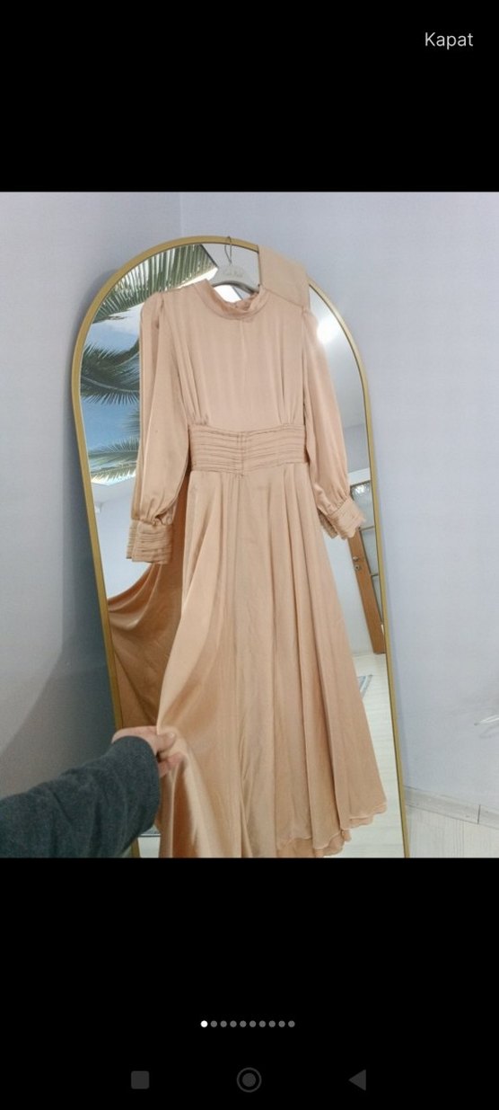 Bej renkte, yüksek yakalı ve uzun kollu, bol kesim kumaştan yapılmış drapeli uzun elbise. Düğün için uygundur.