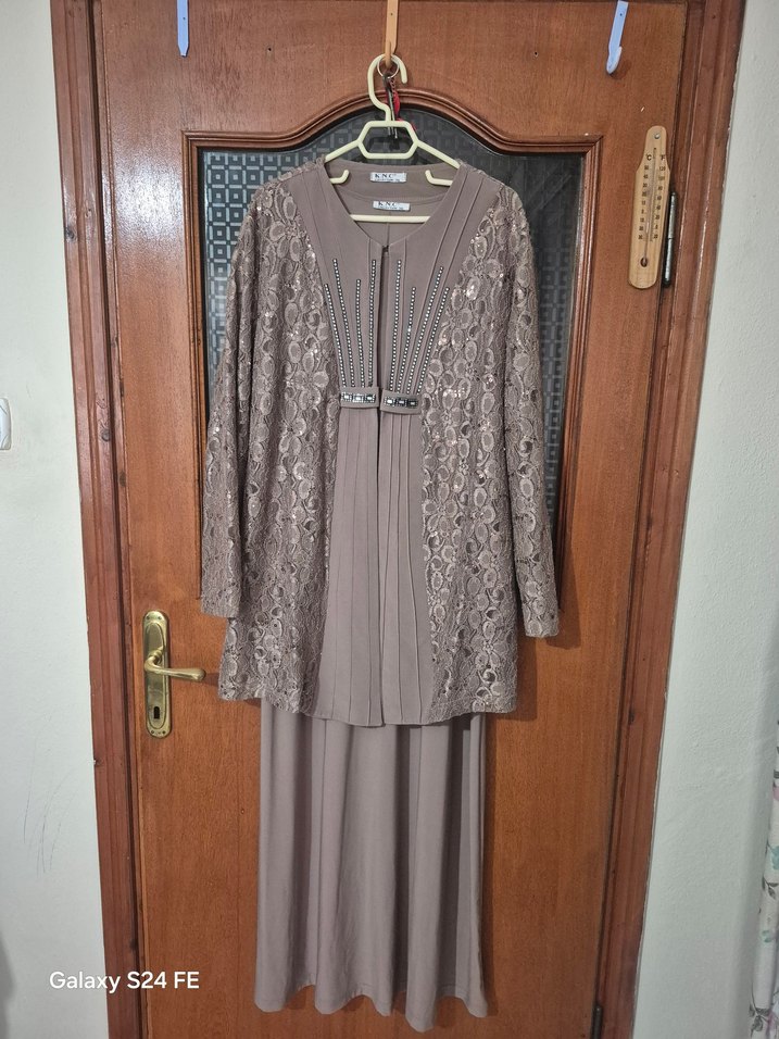 Bej renkte, uzun kollu, drapeli ve notched lapel yakalı, içli dışlı uzun kadın elbisesi. Klasik ve vintage tarzda, düğün için uygundur. omuz:52cm göğüs:60cm boy:1.38cm