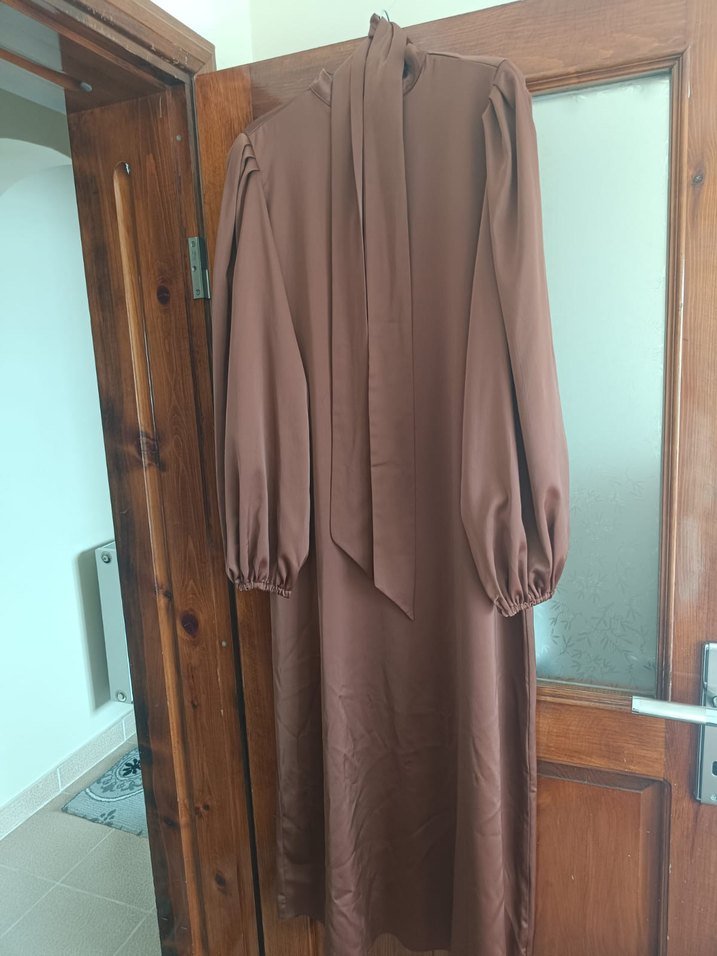 Uzun kollu, yüksek yakalı kadın elbisesi, ipeksi kumaştan drapeli tasarıma sahip. Düzenli kesim, mütevazı ve çağdaş ofis stiline uygun. kahve renkte, desensiz ve Paris tarzını yansıtıyor. şal ile birlikte gondericem