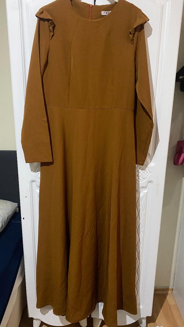 Uzun kollu, tek renk bej elbise, tekne yaka ve drapeli tasarıma sahip. Sentetik kumaştan, günlük kullanıma uygun sade, bohem tarzda regular fit.