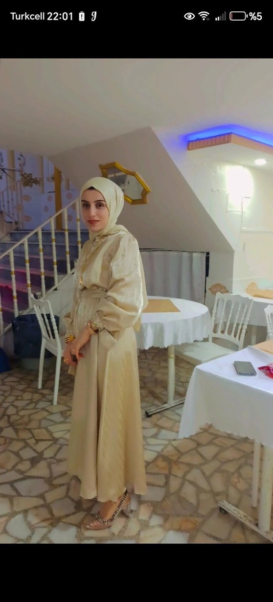 Bej renkte, uzun kollu, yüksek yakalı ve drapeli, bol kesim kadın elbisesi. İpekimsi kumaştan, etnik desenli, düğünler için uygun.
