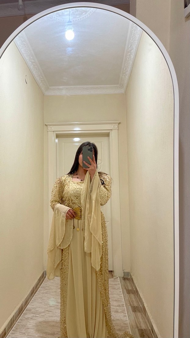 Bej renkli, uzun kollu ve kayık yaka kadın elbisesi. Etnik desenli, ipeksi kumaştan, drapeli ve bol kesimdir. Düğün için uygundur. SATILK