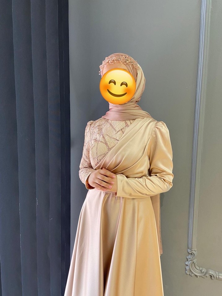 Bej renkli, uzun kollu ve yüksek yakalı bu abiye, drapeli tasarımıyla şık ve sade bir görünüm sunar. Düğünler için uygun, rahat kesimlidir.