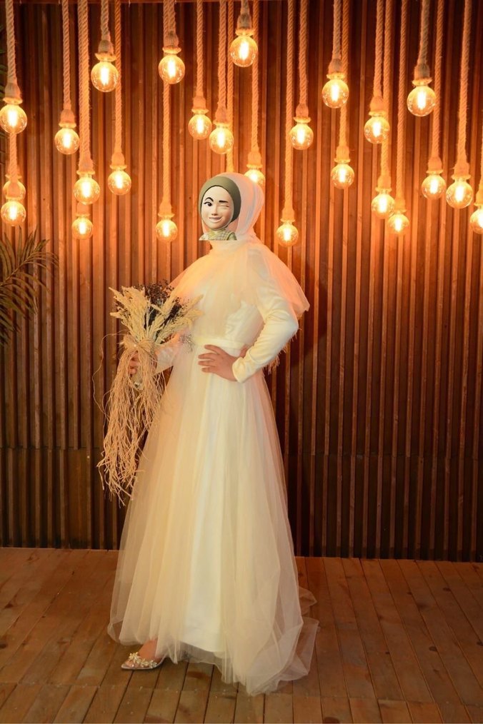Bej renkte, uzun kollu ve yüksek yakalı, etnik desenli, drapeli uzun boy tesettür abiye elbise. Sadece 1 sefer nikahımda kullandım hatası defosu yok ürün temiz 40 beden