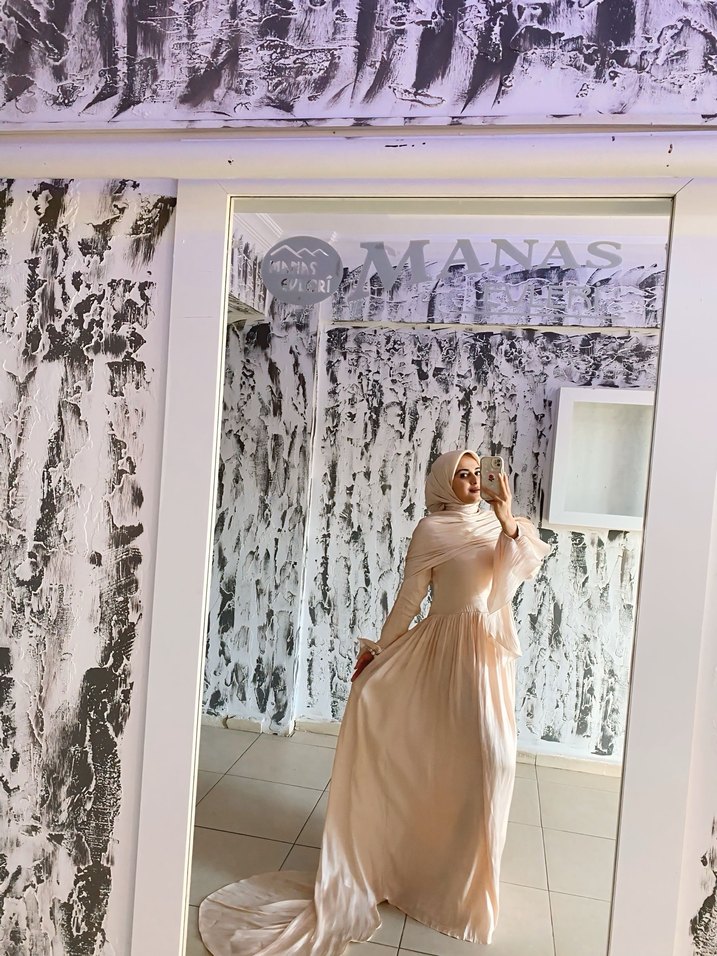 Yüksek yakalı, uzun kollu ve drapeli tasarıma sahip bej uzun elbise, rahat kesimiyle tesettür ve şık düğünler için uygundur.