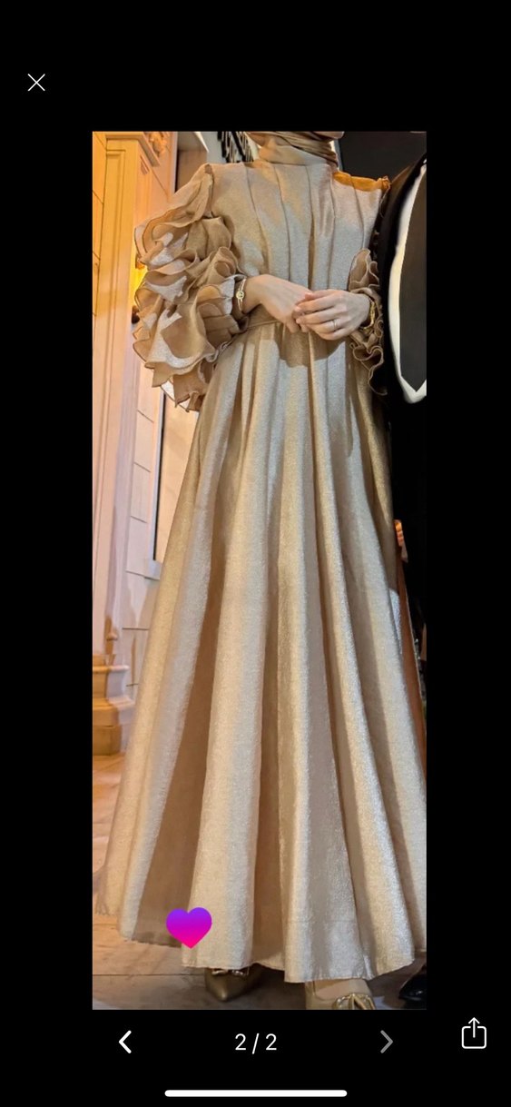 Bej renkte, uzun kollu ve drapeli detaylara sahip straplez yaka abiye. Parlak dokusu ve bol kesimiyle düğünler için uygun. ✨
