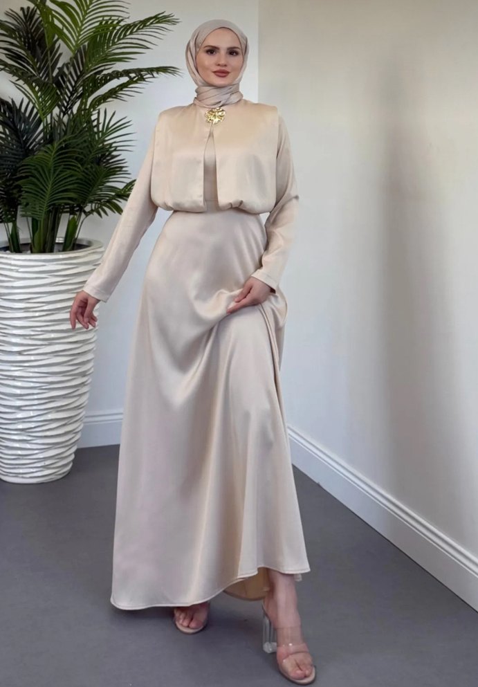 Bej Uzun Kollu Drapeli Uzun Elbise