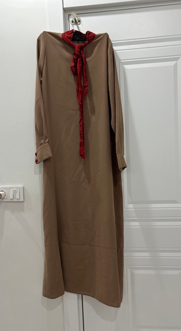 Bej renkte, uzun kollu ve drapeli tasarıma sahip bu uzun elbise, halter yaka ve nakış detayları ile sade bir şıklık sunar. Günlük kullanıma uygundur. Sağ iç kolunda bilek kısmında bir leke vardır .