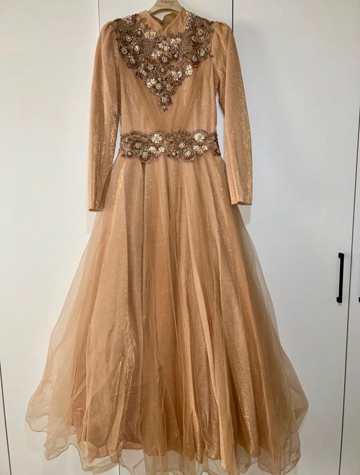 Bej renkli, uzun kollu ve drapeli bu vintage abiye elbise parlak kumaştan, tekdüze desensiz, bol kesimdir. Yaka ve bel kısmında süslemeler bulunur, düğün için uygundur. Kuru temizlemesi yapılmış bir kere giyilmiştir kusursuz tül şalı ile