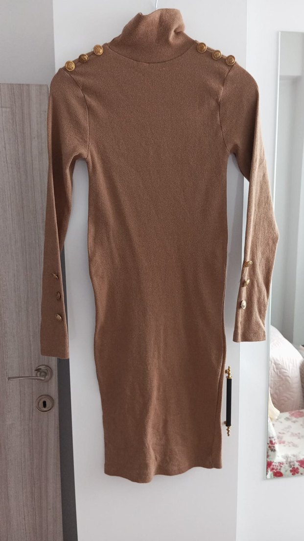 Bej renkte, uzun kollu ve düğme detaylı, vücuda oturan kadın elbisesi. Yuvarlak yaka ve rahat sentetik kumaştan üretilmiştir.