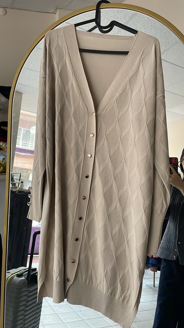 Bej renkli, uzun kollu ve düğmeli kadın hırka. V yaka ve bol kesim ile rahat bir kullanım sağlar. Yumuşak, günlük kullanıma uygun, sokak modasına uygun uzun boyda bir parçadır. soğuk iplik merserize kumaş tüylenme yapmaz lacivert siyah yeşil renkleri de mevcuttur