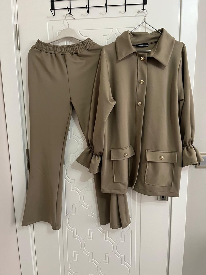 Bej Uzun Kollu Düğmeli Kadın Takım
