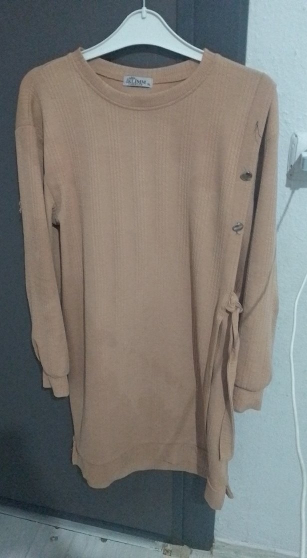 Bej renkli, uzun kollu, düğmeli yan detaylı, salaş kesim triko elbise. Yuvarlak yaka ve yumuşak sentetik kumaştan üretilmiştir.