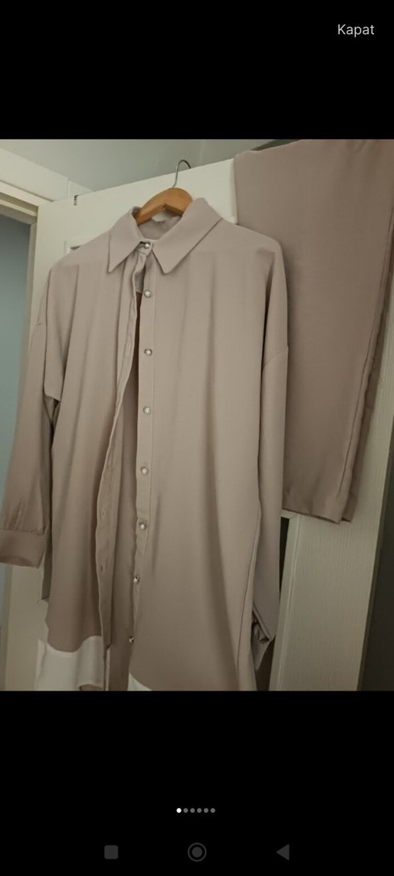 Bej renkli, uzun kollu, düğmeli ve yakalı kadın tunik. Rahat kesimi ve ipeksi dokusuyla günlük sokak stiline uygun, desensiz minimalist tasarım.