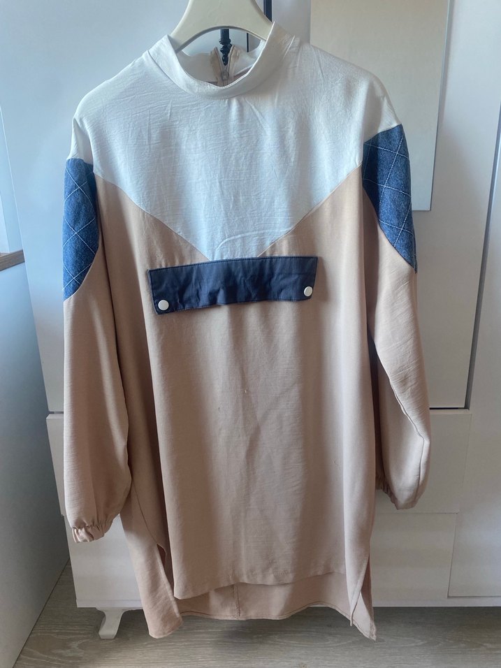 Kadın tunik, bol kesim, uzun kollu ve bisiklet yaka. Yumuşak sentetik kumaştan, bej pastel tonlarında. Kollarında kot detaylı Rahat sokak stili için uygun.