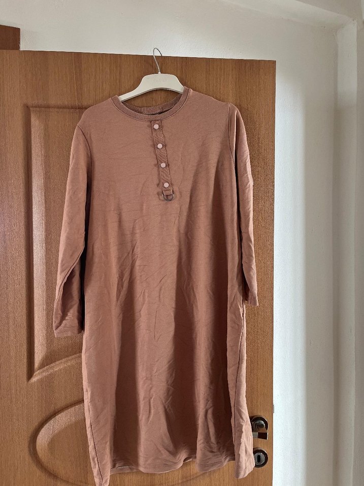 Bej renkte, kumaştan, uzun kollu, düğmeli, yuvarlak yakalı, bol kesim midi tunik. Rahat ve günlük kullanıma uygun.