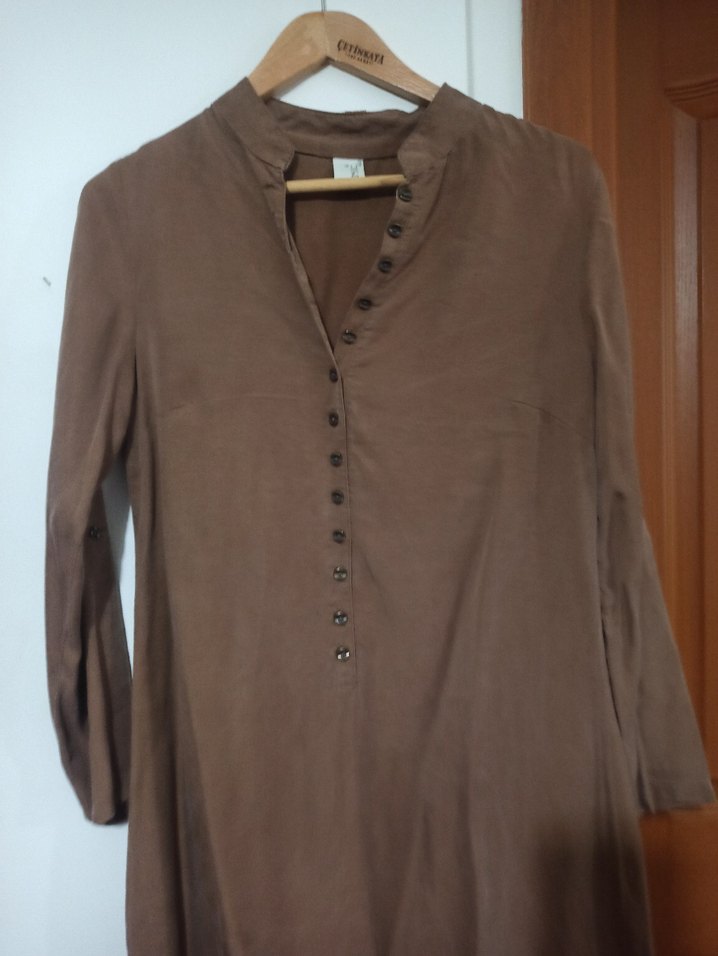 Bej renkli keten kumaştan, uzun kollu, V yaka ve düğmeli uzun tunik. Salaş kesim ve minimalist tarzda, günlük kullanım için uygun.