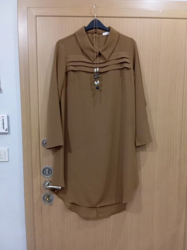 Düğmeli, yakalı ve uzun kollu bej tunik, bol kesimiyle rahat bir kullanım sunar. Minimalist tarzda günlük şıklık için uygundur.