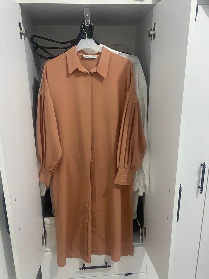 Bej renk, düğmeli ve uzun kollu kadın tunik. Rahat kesimi ve yakalı tasarımıyla günlük kullanıma uygun, yumuşak sentetik kumaştan üretilmiştir.