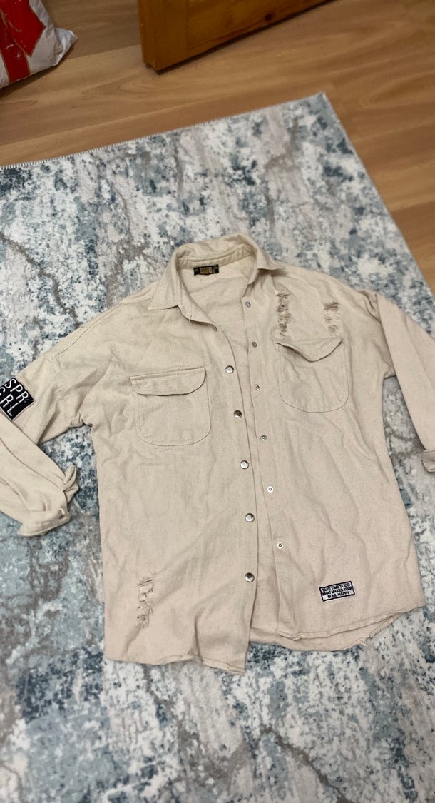 Bej renkli, keten kumaştan uzun kollu, düğmeli ve bol kesim gömlek. Notched yaka ve iki göğüs cebine sahip, gündelik sokak stiline uygun. ️