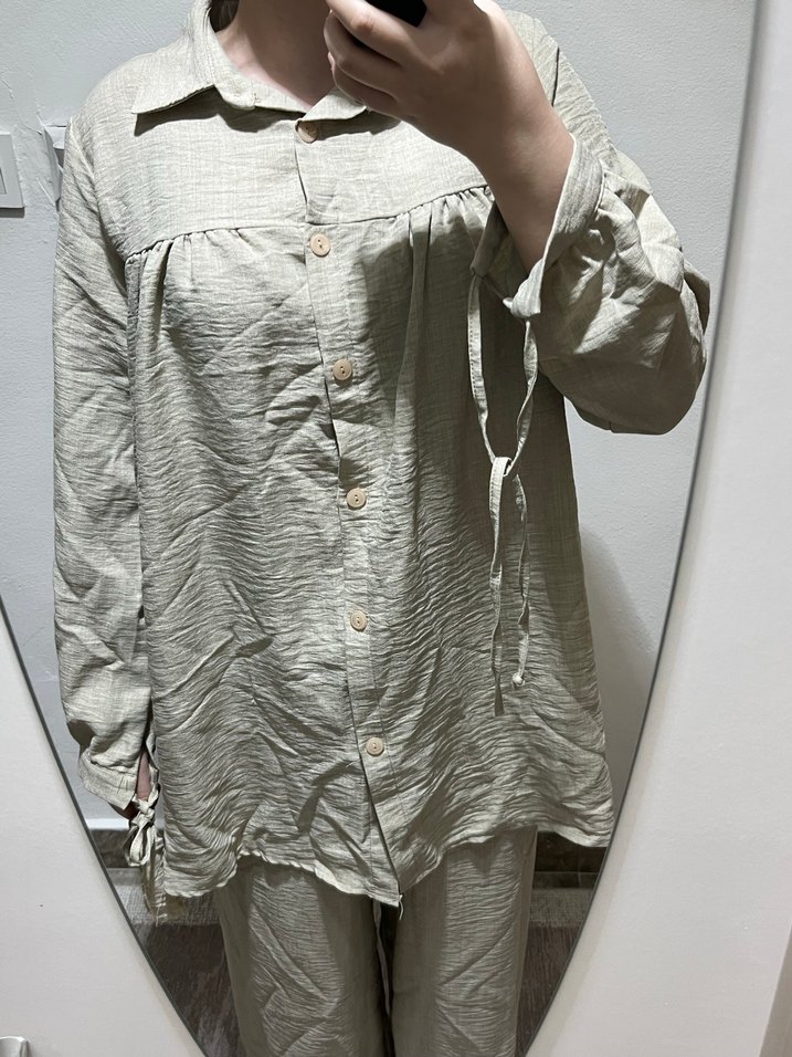 Bej Uzun Kollu Düğmeli Keten Gömlek