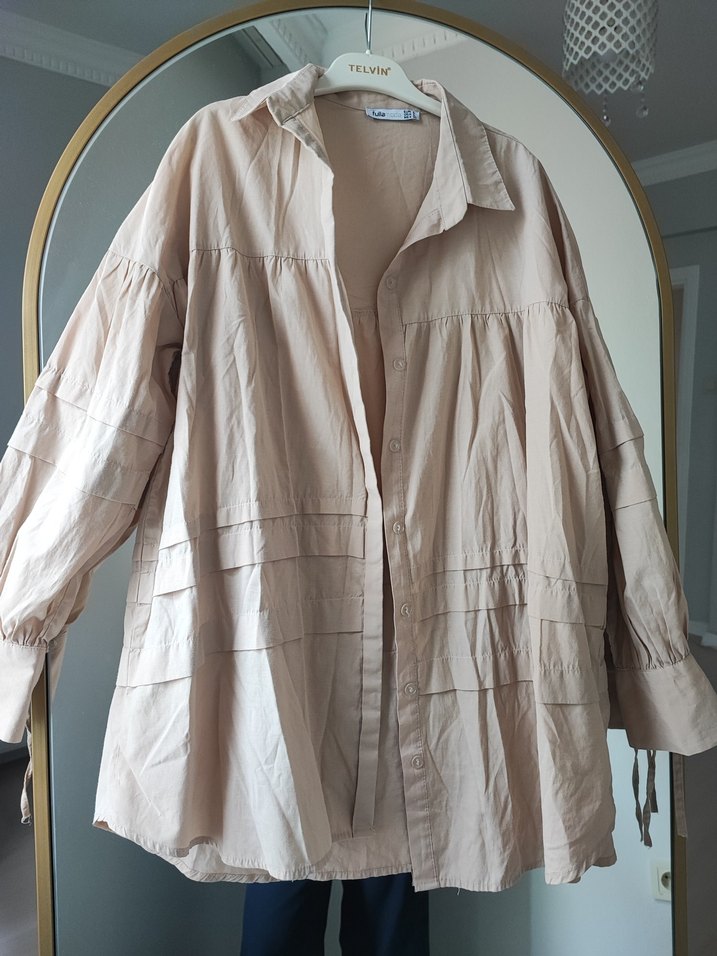 Bej renkli, keten kumaştan, uzun kollu ve düğmeli, bol kesim kadın gömlek. Notlu yakası ve uzun boyu ile bohem Paris tarzını yansıtır.