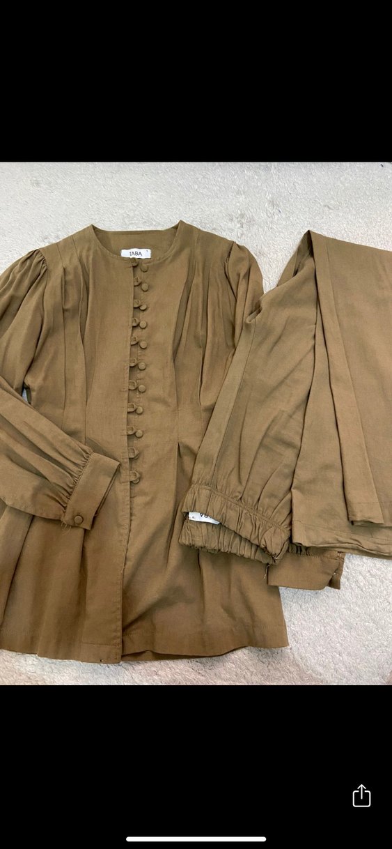 Bej renkte, keten kumaştan uzun kollu ve düğmeli kadın takımıdır. Vintage tarzı ve sade tasarımıyla ofis kullanımı için uygundur.