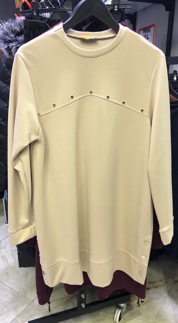 Bej renk, uzun kollu, düğmeli ve salaş kesim tunik. Parlak dokusu ve yuvarlak yaka detayı ile günlük rahat stil için uygundur. ✨