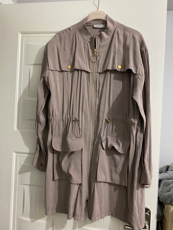 Bej renkli, düğmeli detaylara sahip uzun kollu, bol kesim trençkot. Keten kumaştan yapılmış, günlük kullanım için uygundur ve Paris tarzını yansıtır. 1 kez giyildi yeniden farksız 36 42 bedene kada olur