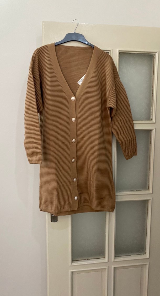 Bej renkli triko hırka, düğmeli önde, V yakalı ve uzun kolludur. Rahat kesimi ve uzun boyuyla konforlu bir tarz sunar.
