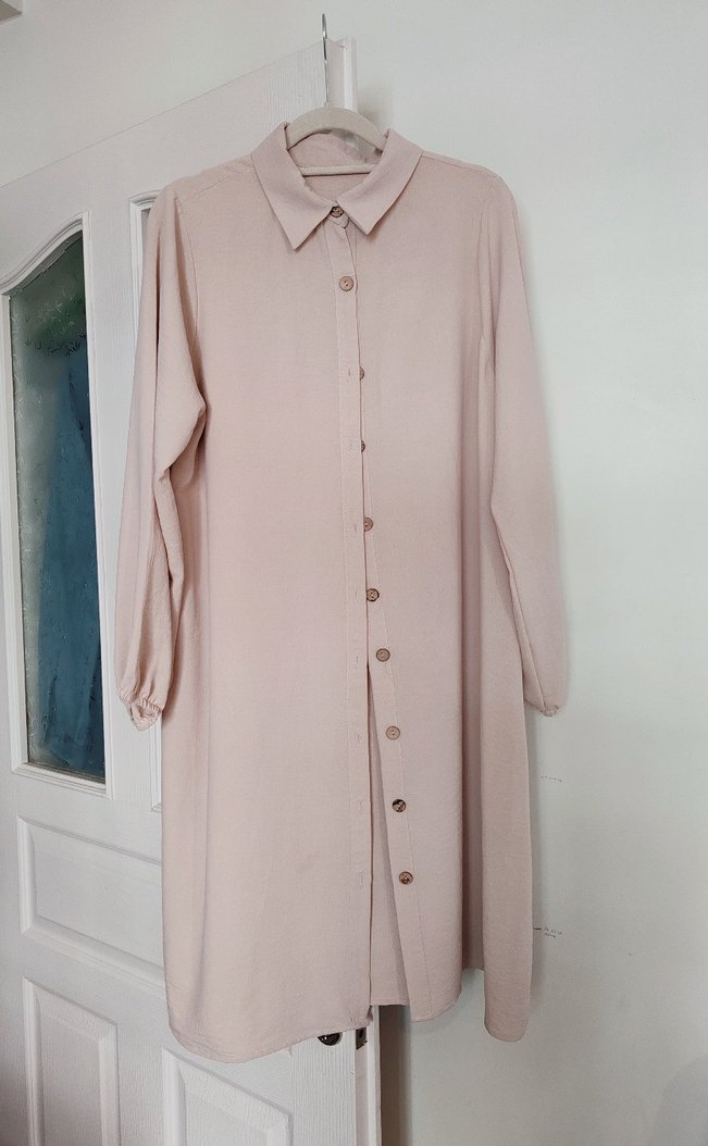Dökümlü ayrobin kumaştan, düğmeli ve erkek yaka detaylı, kolları lastikli uzun bej tunik. Uzun kollu rahat kullanım, buruşmaz, ütü istemez, 38-40-42 bedenlere olabilir. Omuzdan boyu 95-96 santim. Güzel günlerde giyin.