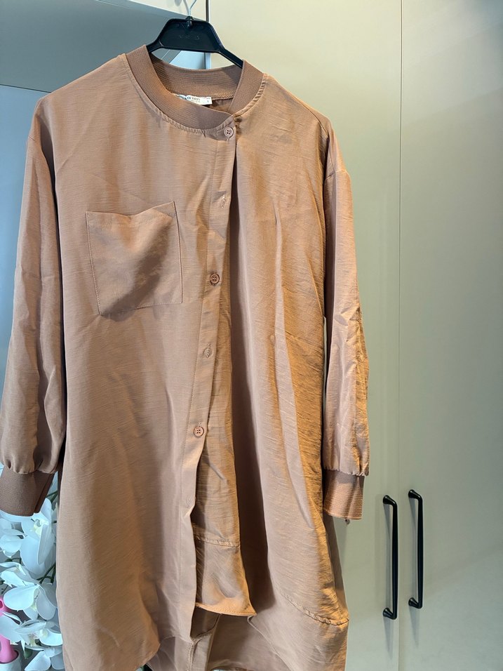 Bej renkli, uzun kollu, düğmeli ve tek cep detaylı bol kesim tunik. Günlük sokak stili için uygundur.