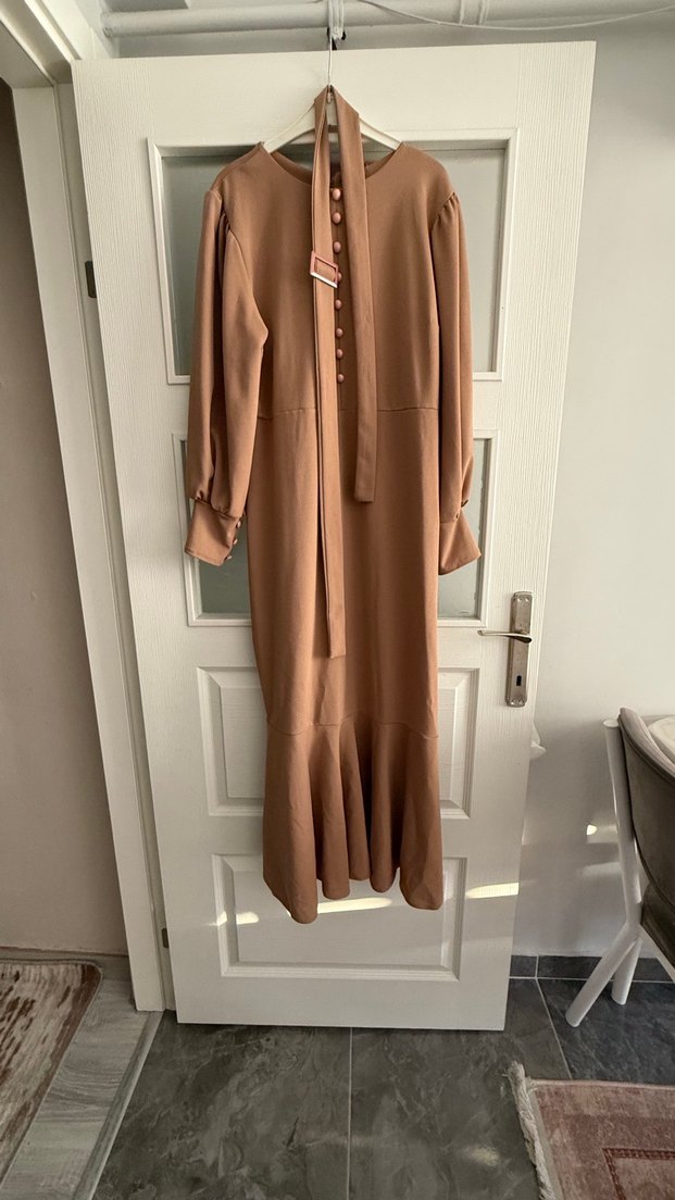 Bej renkte, uzun kollu, düğmeli ve yakalı uzun elbise. Düzenli kesim ve yumuşak sentetik kumaştan üretilmiştir, günlük kullanıma uygundur.