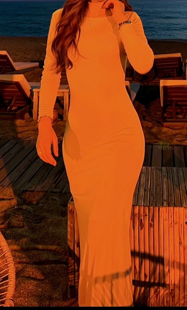 Bej renkte, uzun kollu sırt dekolteli uzun streç dokuda yumuşacık kumaşa sahip elbise hiçbir sorunu kusuru yoktur iç göstermez fiziği mükkemmel gösterecek elbise eyyo markalı 36-38 bedene uyumlu olucaktır