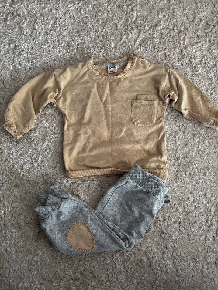 Bej uzun kollu, yuvarlak yakalı ve ön cepli üst ile gri, yumuşak detaylı pantolondan oluşan erkek bebek takımı. Konforlu, sıcak kumaş kullanılmıştır.