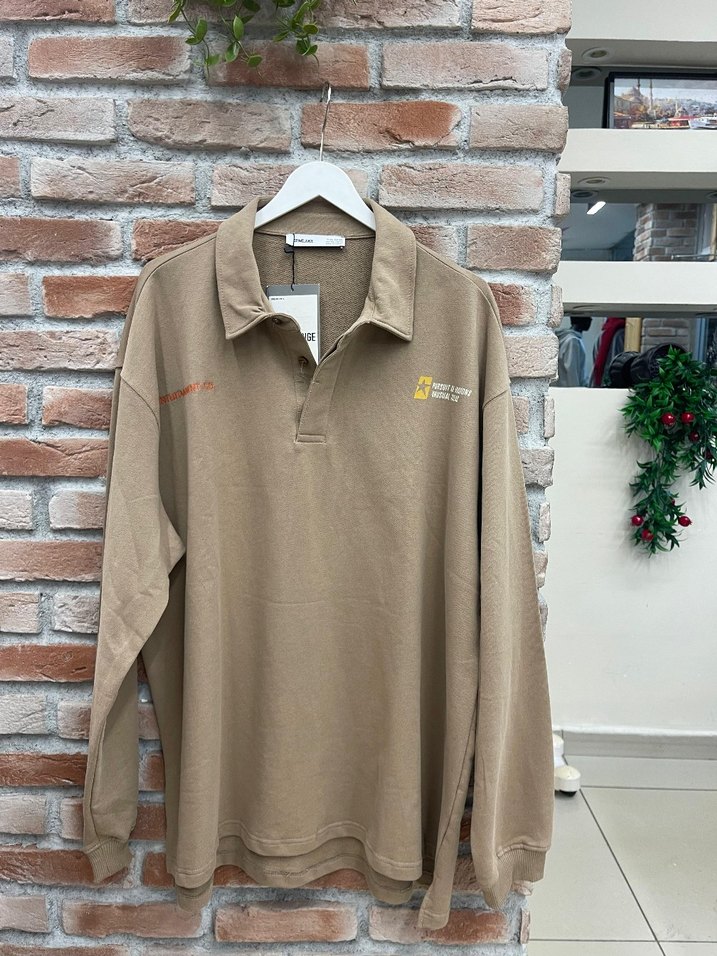 Bej renkli, uzun kollu erkek sweatshirt. Keten kumaştan, yakalı ve düğmeli, rahat kesim ve baskılı desene sahip, günlük kullanıma uygun.