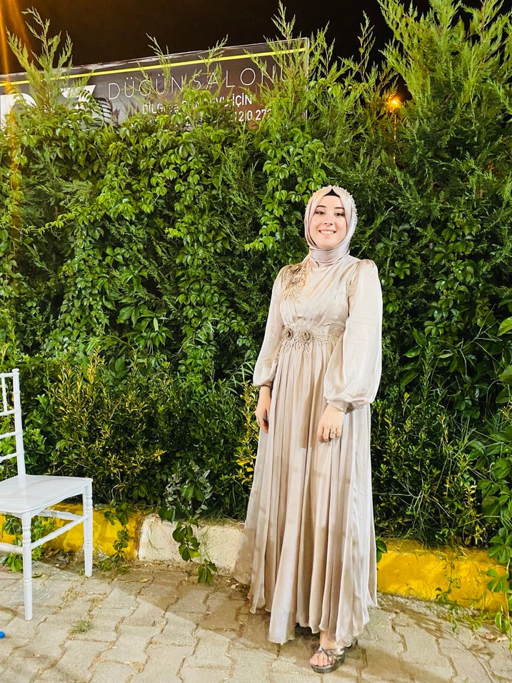 Bej renkte, uzun kollu ve yüksek yakalı etnik desenli elbise. Salaş kesim ve drapeli tasarımıyla, bohem ve sade bir düğün elbisesi. 2 kere giyildi deformesi yoktur