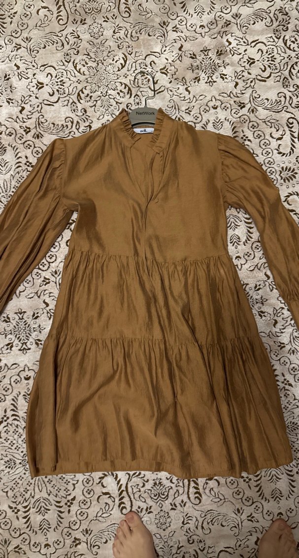 Bej renkli, uzun kollu, bol kesim bohem elbise. V yaka ve fırfır detaylara sahip, parlak dokulu, günlük kullanıma uygundur.