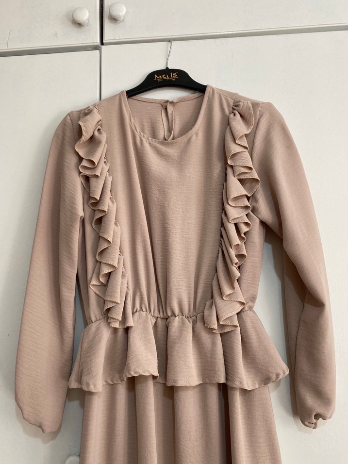 Bej renkli uzun kollu elbise, yuvarlak yakalı ve fırfır detaylıdır. Rahat kesimli ve yumuşak sentetik kumaştan yapılmıştır, klasik sokak stiline uygun pastel tonlardadır.