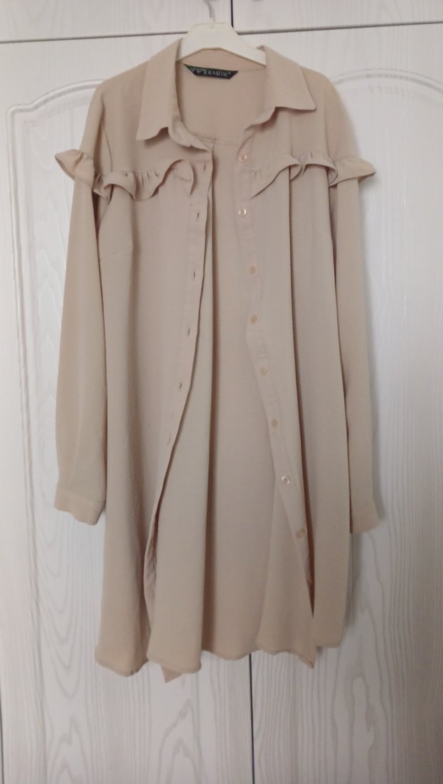 Bej , uzun kollu, fırfırlı ve yakası yaka detaylı bol kesim bohem tunik. Günlük kullanıma uygundur.