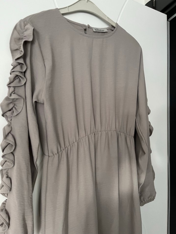 Bej Uzun Kollu Fırfırlı Kadın Elbise