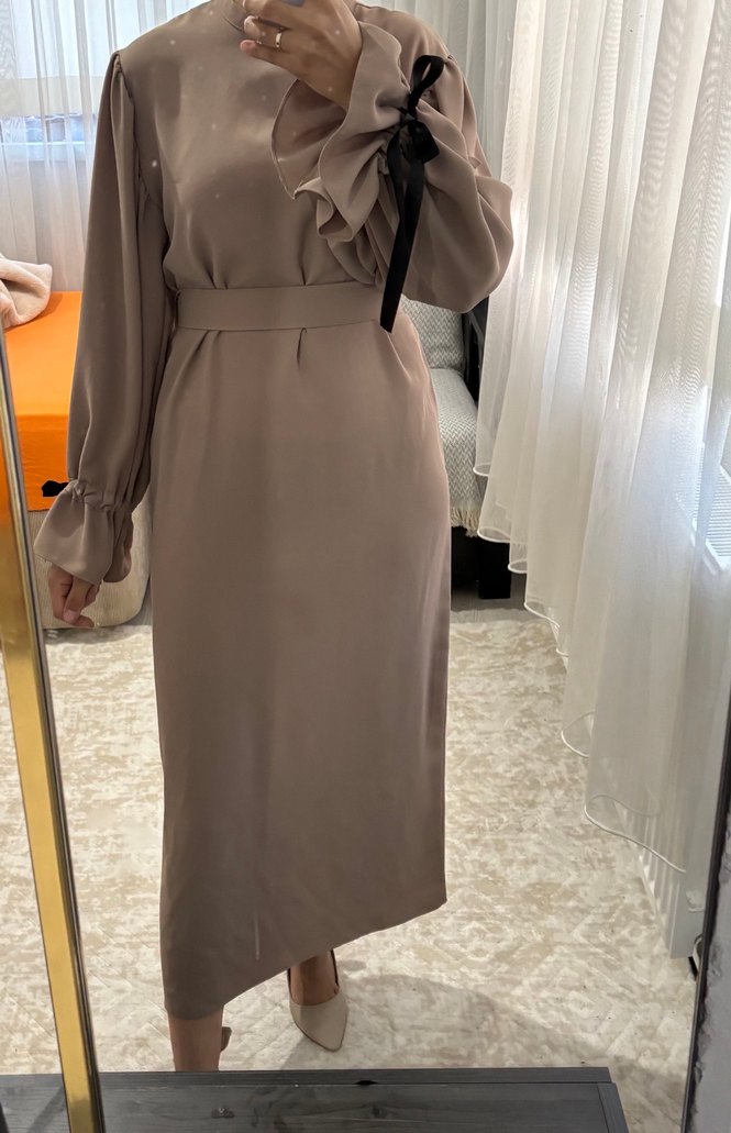 Bej renkte, yüksek yakalı ve bol kesimli uzun elbise, kol detaylarında fırfır bulunur. Hafif sentetik kumaştan, modern iş ortamı için uygundur.