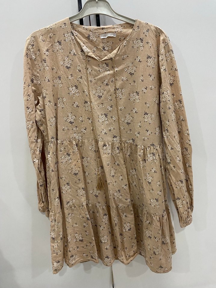 Yumuşak keten kumaştan, V yakalı, uzun kollu ve bol kesim bej tunik. Fırfır detaylı ve hafif çiçek desenlidir. 38–40-42 beden uyuyor