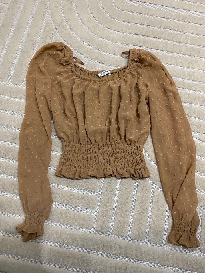 Bej renkli, uzun kollu, fırfırlı ve tek renk keten bluz. Boğaz yakalı ve beli oturan, bohem tarzına uygun rahat bir parça.