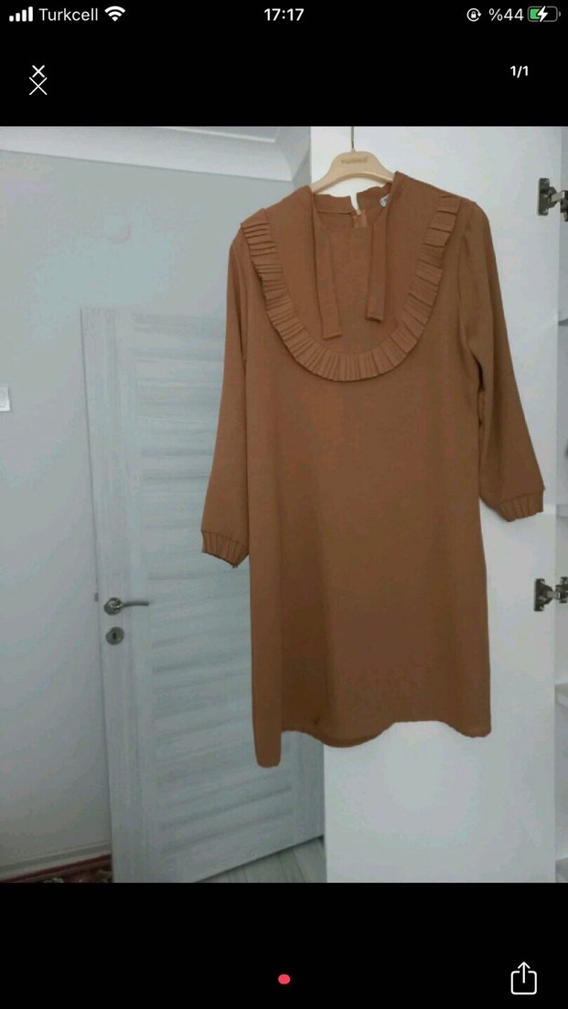 Bej renkli, uzun kollu ve yakalı keten tunik. Ön kısmında fırfır detayları ve bol kesimi vardır. Rahat ve minimal bir görünüm sunar.